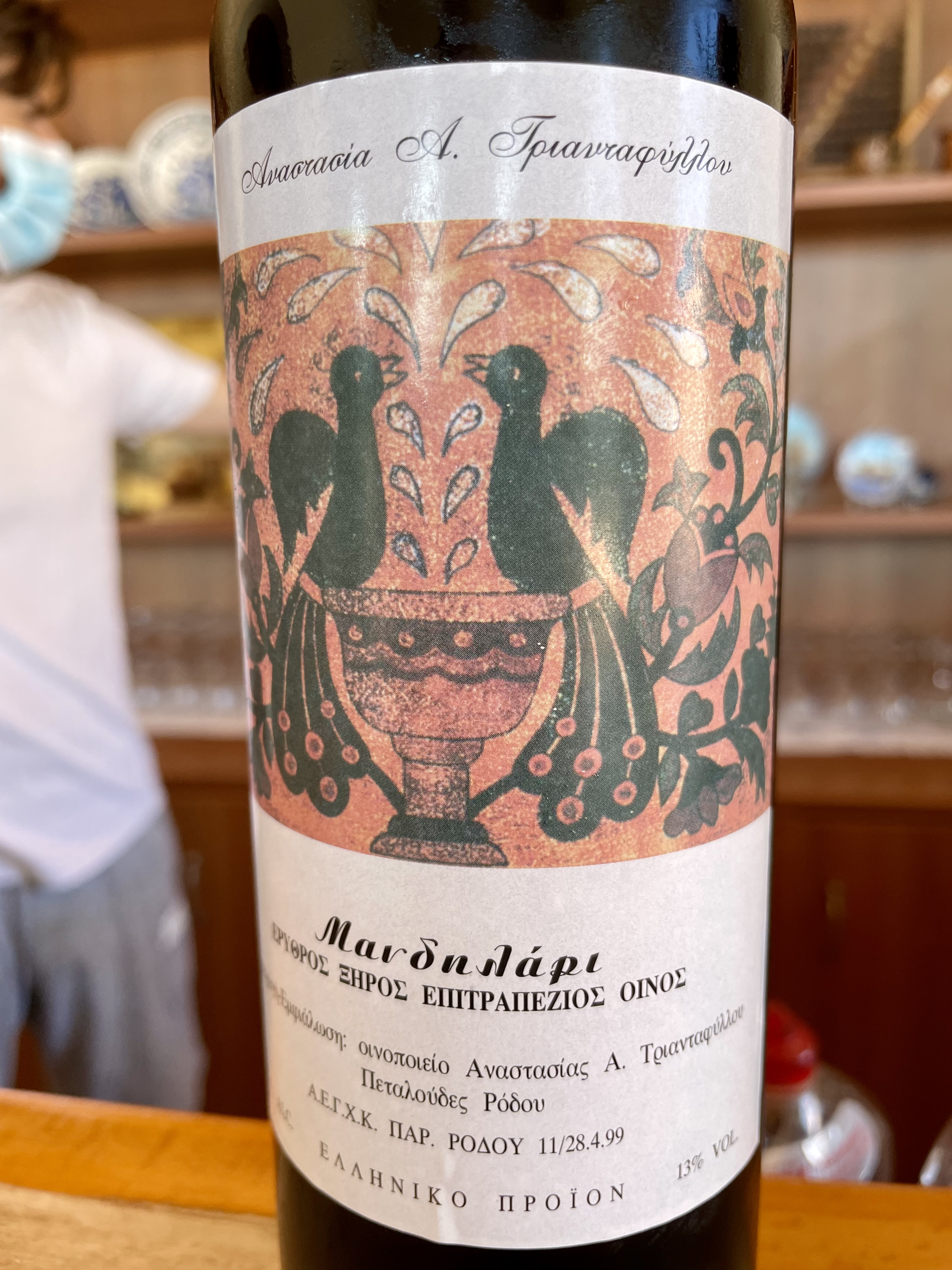 Open since 1928, Kounaki describes itself as a “traditional” winery and its name is all over Embonas. I don’t know what “traditional” really means, but Kounaki seems like a hometown operation with lots of family members working in the winery. Kounaki produces about 10 types of wine, both Greek varietals and European, with distribution almost exclusively on Rhodes. We did not tour the actual vineyards of Kounaki, instead its outdoor tasting room, complete with all types of wine themed things and some neighboring chickens!