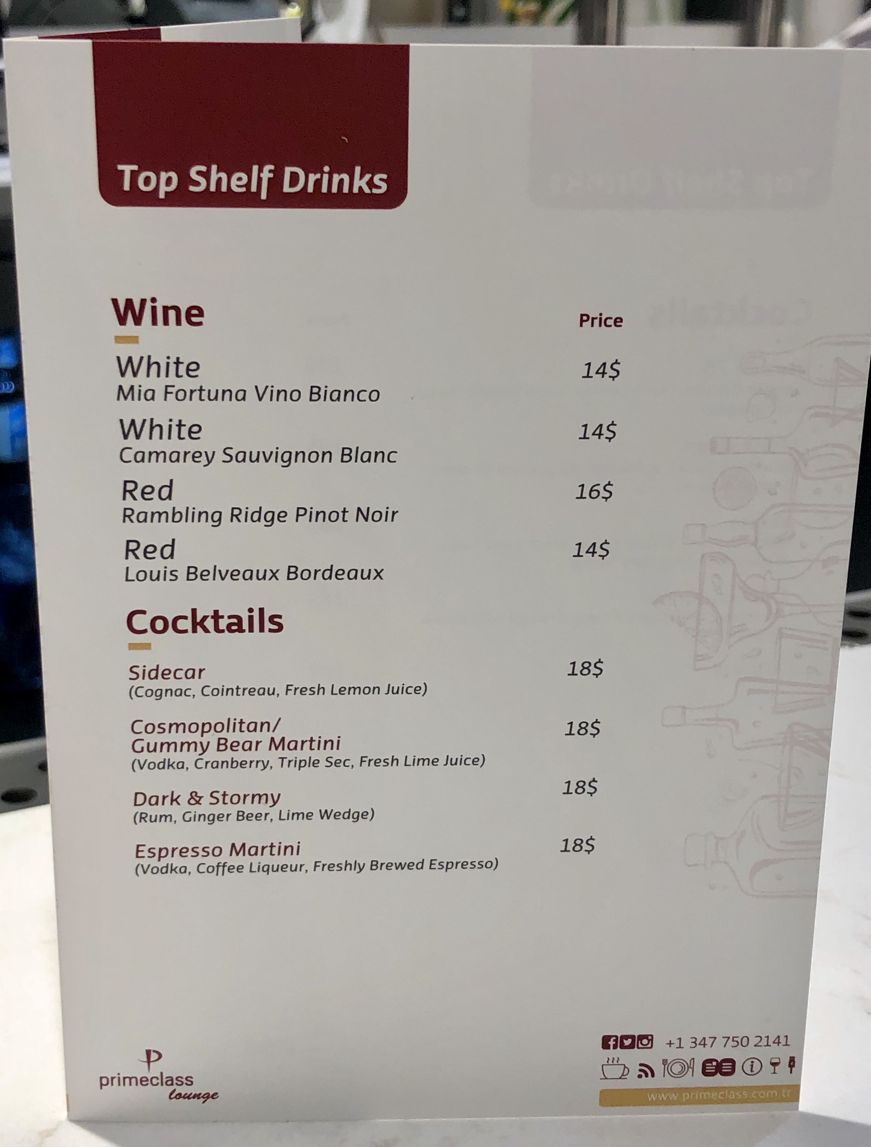 Primeclass Lounge: JFK Terminal 1, Post-Security, Near Gates 8 & 9. Open Monday, Thursday, and Sunday 05:30 – 00:00, Tuesday, Wednesday, and Friday 09:00 – 00:00. May 4 hour stay. Two complimentary alcoholic drinks per person.  Other alcohol and “premium” drinks and cocktails cost money. Printer available in the lounge. Complimentary access for Priority Pass members. The General Public can buy access for $59.00 for four hours.